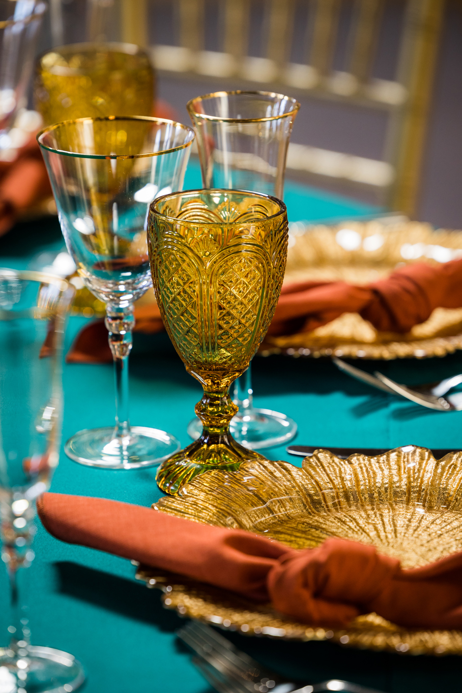 We're very excited about these two plates which we think will be very popular in the gala dinner space. Available in gold and silver, these plates really pop out when paired with coloured linens and coordinating glasses as you can see from the below images: