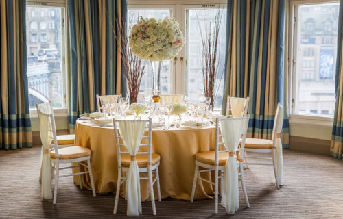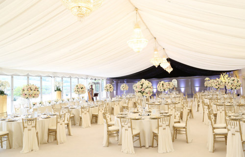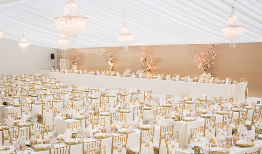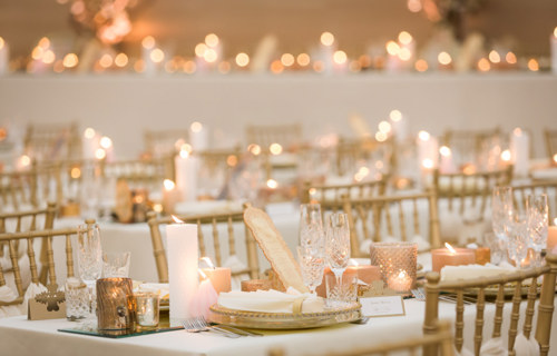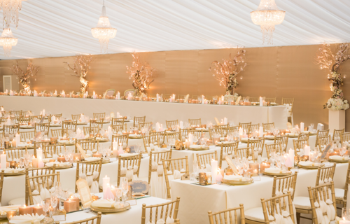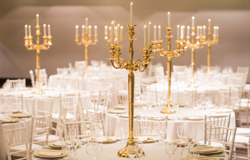 © 88 Events - Cream Essential linen, ivory Chiavari chairs and gold candelabras