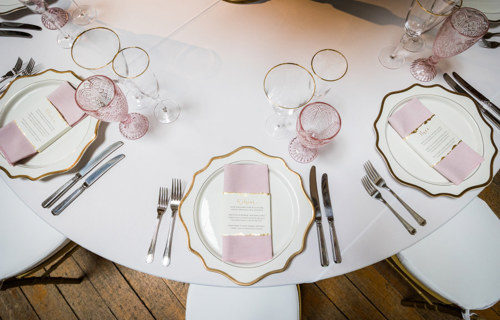 White Essential linen, peony Gelato napkins with gold trim Porcelain plates, gold trim glasses & pink goblet