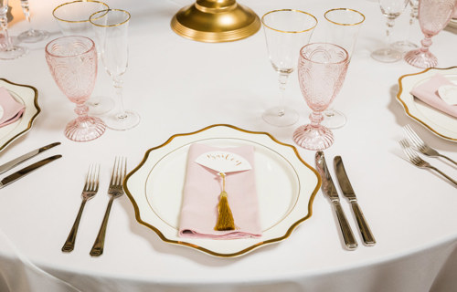 © 88 Events - White Essential linen, peony Gelato napkins with gold trim Porcelain plates, gold trim glasses & pink goblet