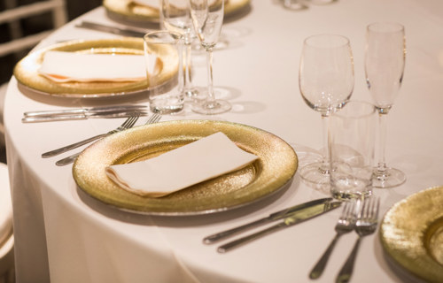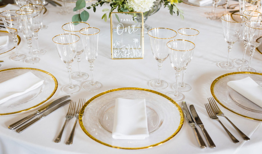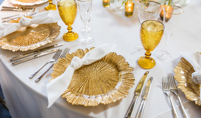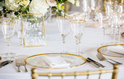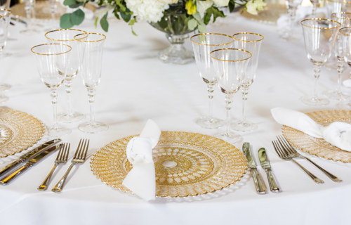 © 88 Events - White Essential linen, gold trim charger plates & gold trim glasses