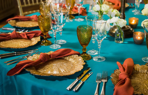 © 88 Events - Teal Essential linen, burnt orange Gelato napkins, gold Petal charger plates, gold trim glasses & amber goblets
