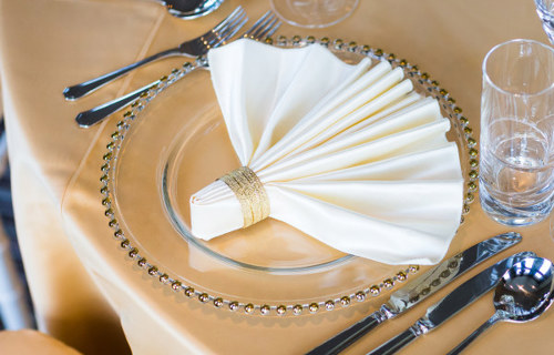 © 88 Events - Golden Verona linen, vanilla Milano napkin fan & gold beaded charger plate
