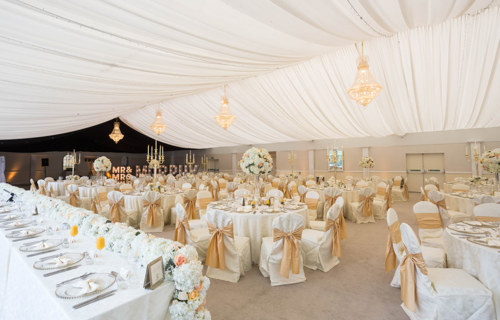 © 88 Events - Cream Damask linen & chair covers with champagne Faux Silk ties