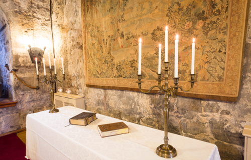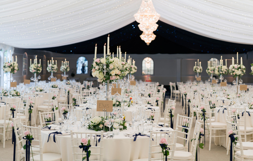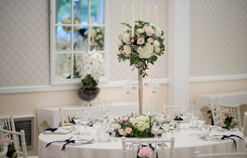 Wrought Iron Candelabra 77cm with navy Essential linen & chair covers & Lyndsay Tartan accents