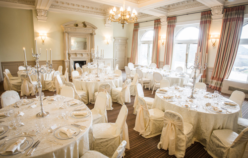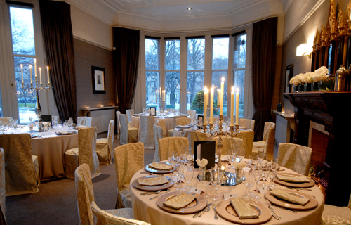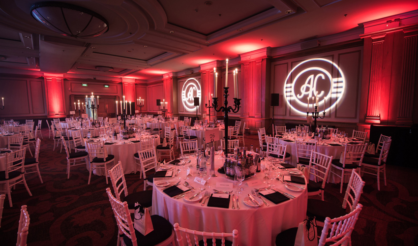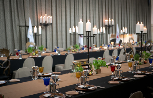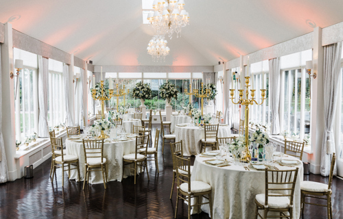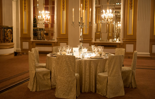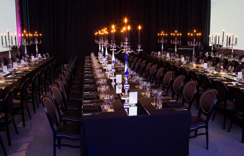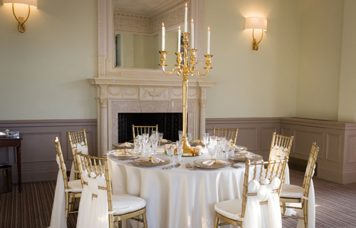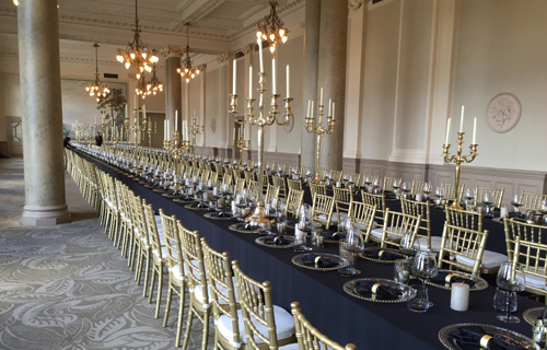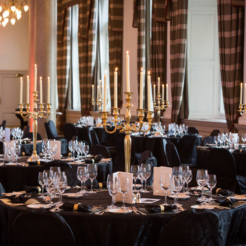 © 88 Events - Gold Candelabra 80cm with noir Damask linen & chair covers