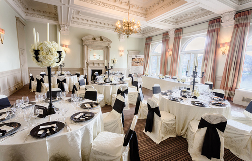 Black Gloss Candelabra 106cm with cream Damask linen & chair covers