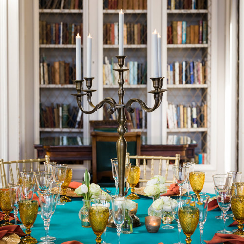 Bronze candelabra, Gold Petal charger plates with teal Essential linen, burnt orange Gelato napkins, amber goblets & gold trim glasses