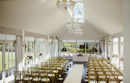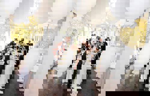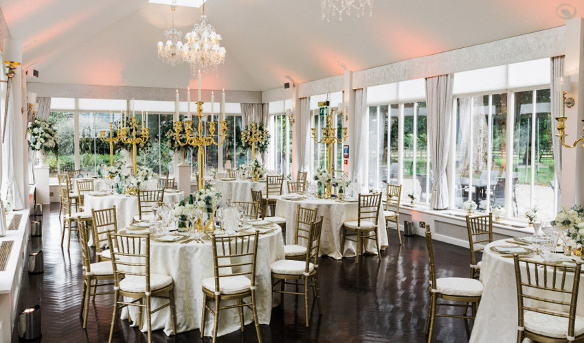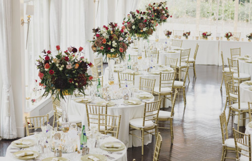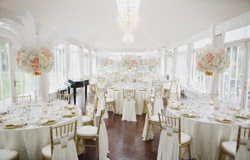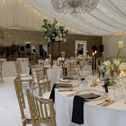 © Carlowrie Castle - White Essential linen, gold Trim chargers & gold Chiavari chairs with Valentina weaves
