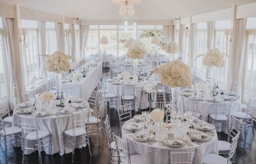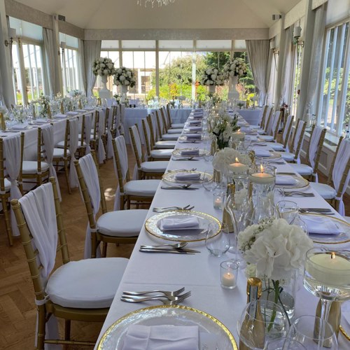 White Essential linen, gold Trim chargers & gold Chiavari chairs with Valentina weaves