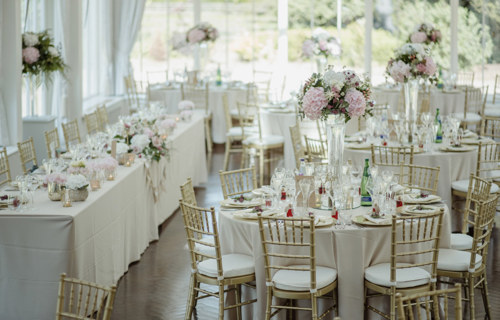 Cream Damask linen with gold Chiavari chairs & Santina weaves