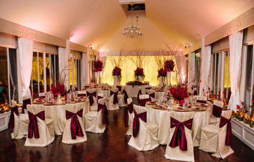 Latte St. Tropez linen & chair covers with burgundy Taffeta ties