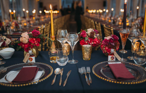 © Carlowrie Castle - Navy Essential linen, plum Faux SIlk napkin, gold beaded charger & gold Chiavari chairs