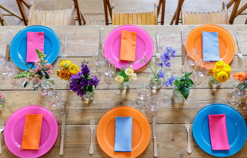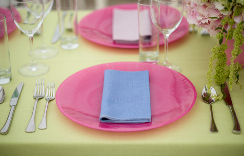 Fuchsia charger plate with pistachio Gelato linen & violet cream Gelato napkin