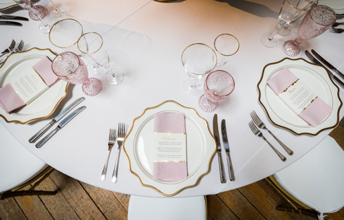 Pink & gold trim Porcelain charger plates with cream Essential linen, blush Verona napkins & gold trim glasses