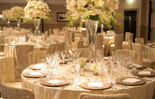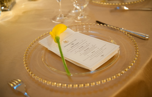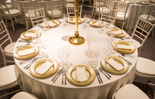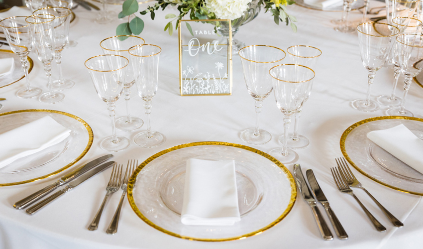 © 88 Events - Gold trim charger plates with cream Essential linen & gold trim glasses