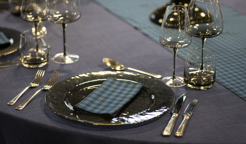 © 88 Events - Smoke grey charger plate with denim Gelato linen, Barra Tartan napkin & smoke grey glasses
