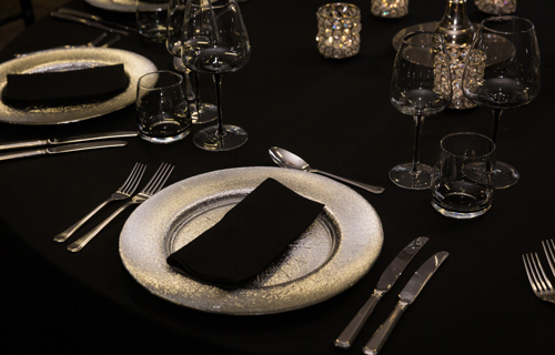 © 88 Events - Silver starburst charger plates with black Essential linen & smoke grey glasses