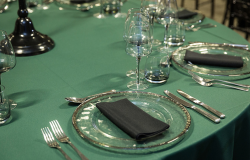 © 88 Events - Silver trim charger plates with green Essential linen, black Essential napkin & smoke grey glasses