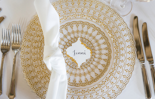 © 88 Events - Gold trim Porcelain charger plates with cream Essential linen & peony Gelato napkins