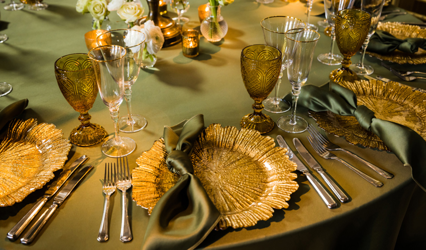 Gold Petal charger plates with moss Verona linen, amber goblets & gold trim glasses