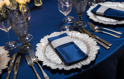 © 88 Events - Silver charger plates, silver Milano linen, navy Damask napkins & cut crystal glasses