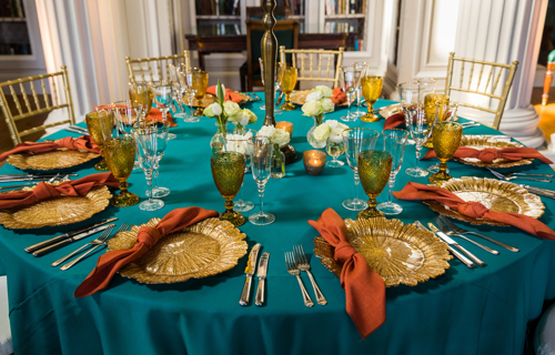 © 88 Events - Gold Petal charger plates with teal Essential linen, burnt orange Gelato napkins, amber goblets & gold trim glasses