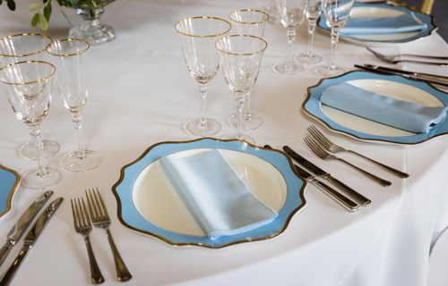 Blue & gold trim Porcelain charger plates with cream Essential linen, powder blue Verona napkins & gold trim glasses