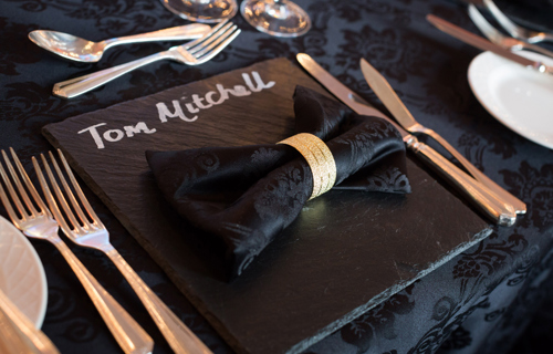 © 88 Events - Slate Charger Plate with noir Damask linen & napkin