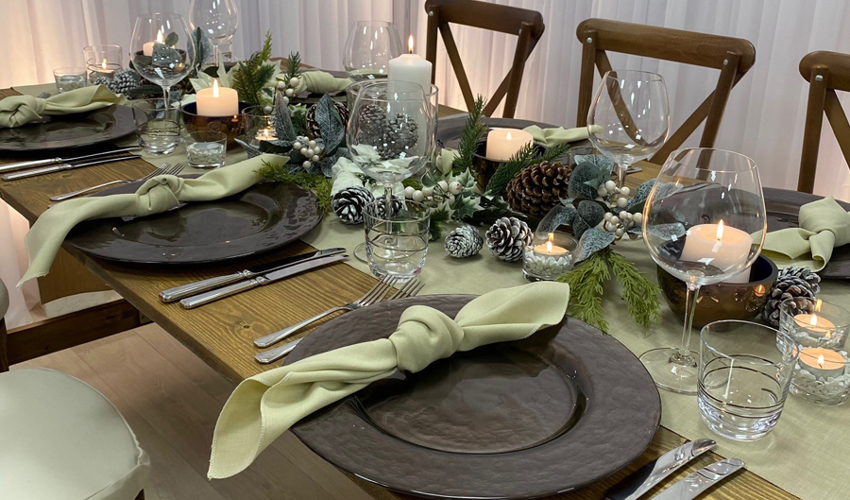 Silver trim charger plates with green Essential linen, black Essential napkin & smoke grey glasses