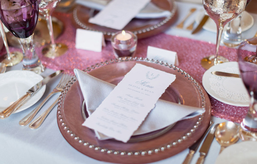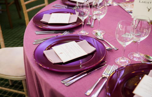 © 88 Events - Fuchsia charger plate with pistachio Gelato linen & violet cream Gelato napkin