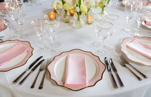 © 88 Events - Pink & gold trim Porcelain charger plates with cream Essential linen, blush Verona napkins & gold trim glasses