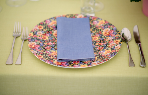 Floral china charger plate with pistachio Gelato linen & violet cream Gelato napkin