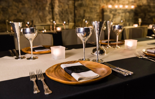 © 88 Events - Wooden charger plate with black Essential linen, caramello Gelato runner & napkin & pewter gobet & chalice