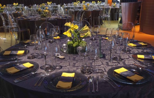 © 88 Events - Silver Petal charger plates with twilight Verona linen & smoke goblets