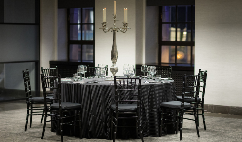 Black Chic linen, black Chiavari chairs & tall silver square base candelabra