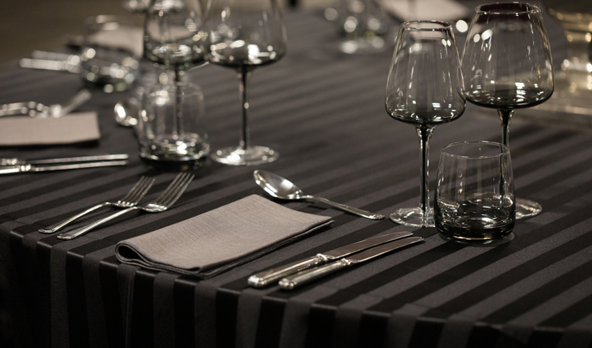 © 88 Events - Black Chic linen, graphite Gelato napkins & smoke grey glasses