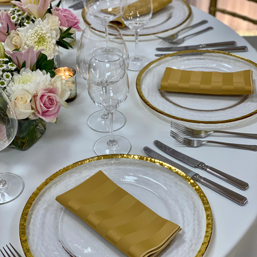 © 88 Events - Gold Chic napkins, white Essential linen & gold trim charger plates