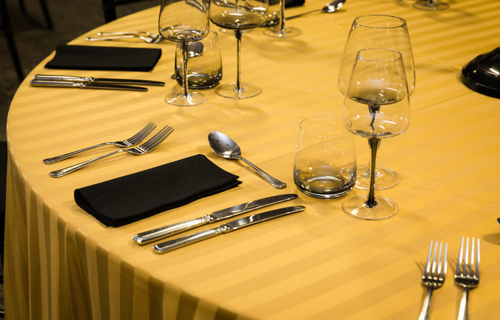 © 88 Events - Gold Chic linen, black Essential napkins & smoke grey glasses