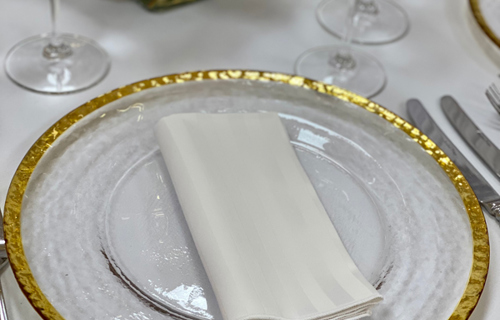 Ivory Chic napkins, white Essential linen & gold trim charger plates