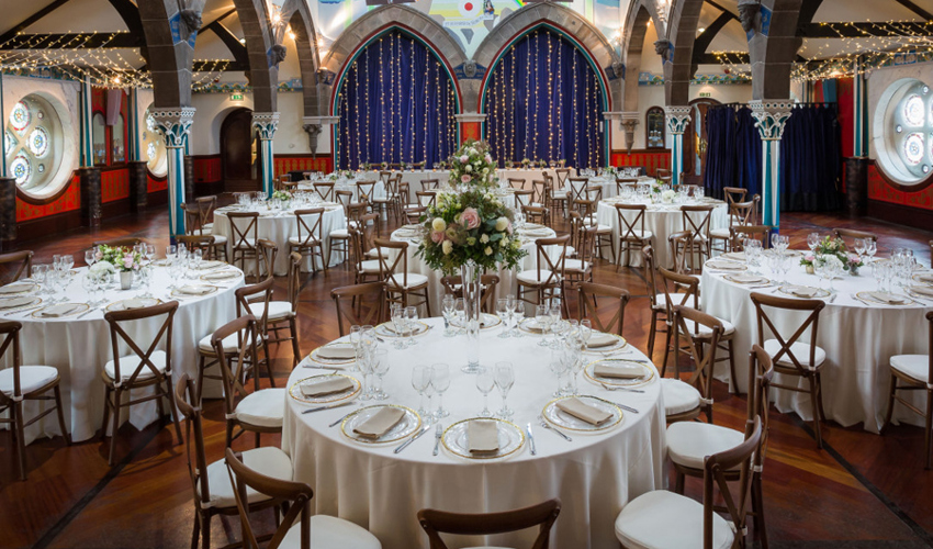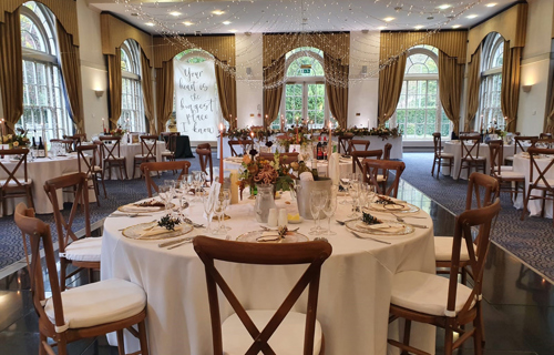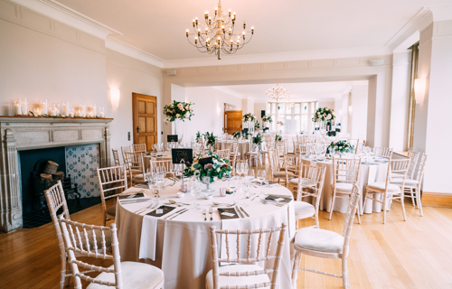 © Scottish Wedding Directory - Wedgewood Essential napkin, cream Essential linen, gold beaded charger & ivory Chiavari chairs