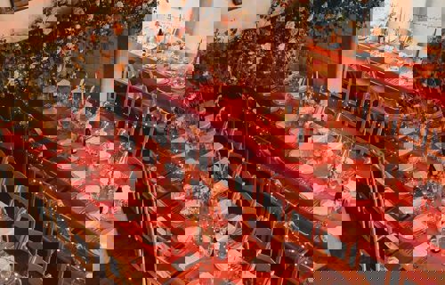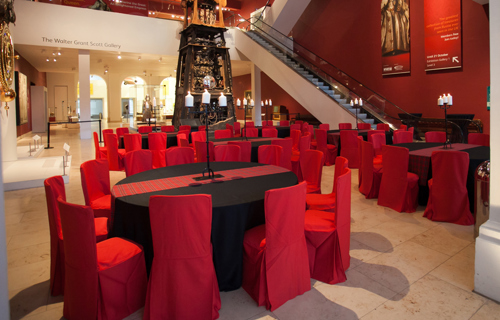 Red Essential chair covers, black Essential linen, Royal Stewart Tartan runner & wrought iron candelabra
