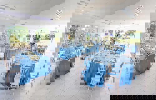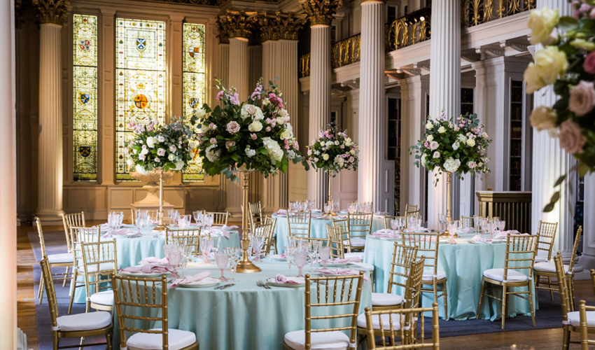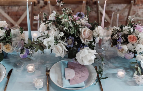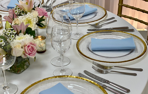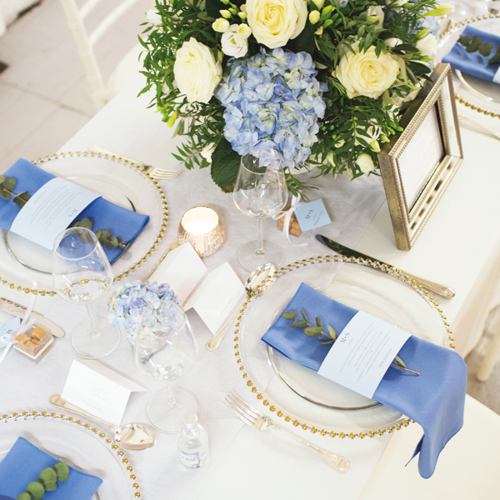 © 88 Events - Sky blue Essential napkin, white Essential linen & gold trim charger