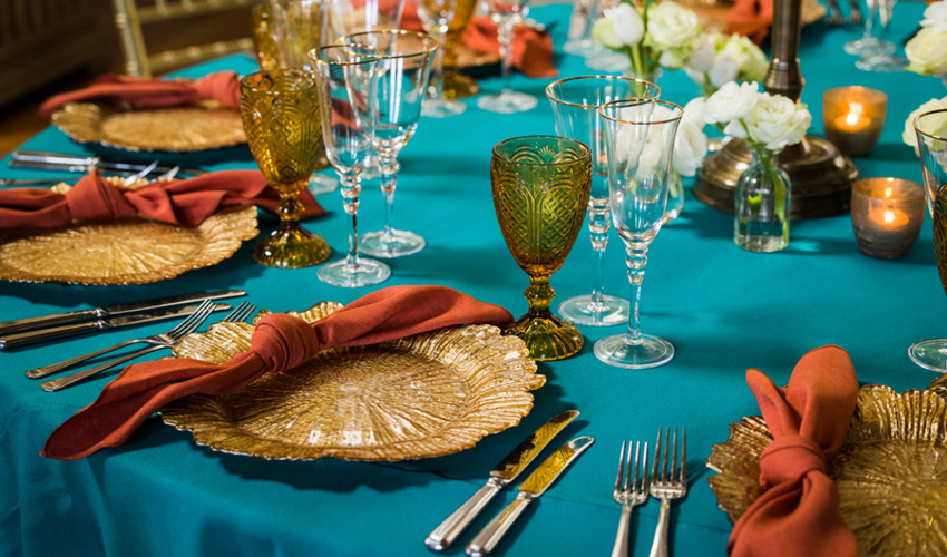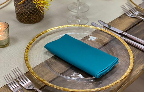 Teal Essential napkin, caramello Gelato runner, gold trim charger & rustic table