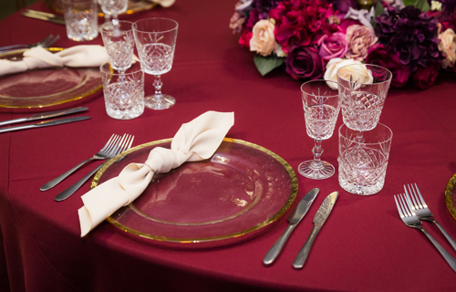 © 88 Events - Wine Essential linen, cream Essential napkin, gold trim charger & Cut Crystal glasses