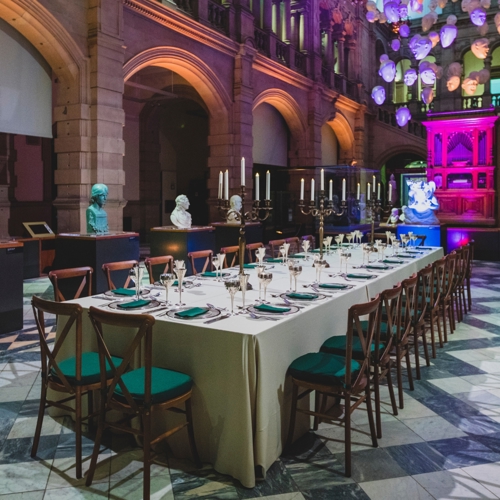 © Glasgow Life - Biscuit Essential linen, green Essential napkin, Crossback chairs with green pad