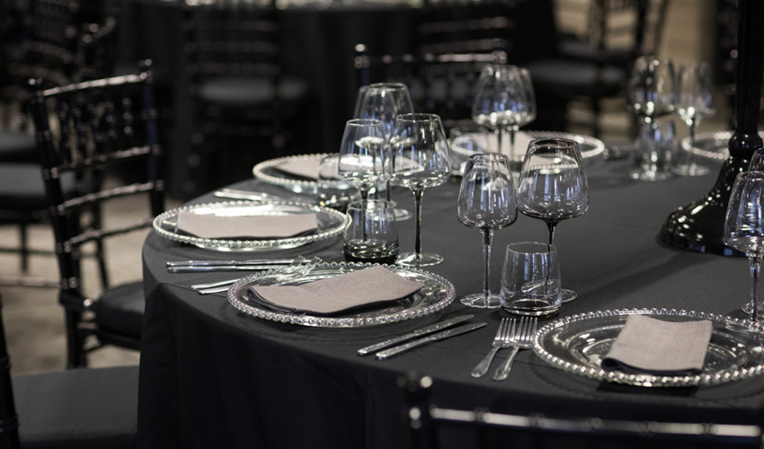 © 88 Events - Black Essential linen, graphite Gelato napkin, silver beaded charger & smoke grey glasses