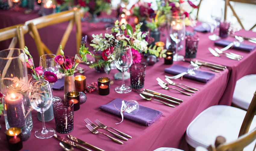 © 88 Events - Purple Essential table runner & napkin, gold trim charger & rustic table