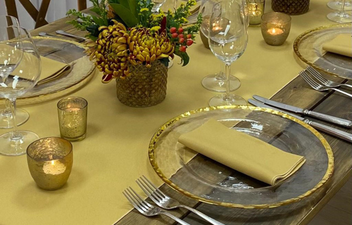 © 88 Events - Gold Essential runner & napkin, gold trim charger, rustic table