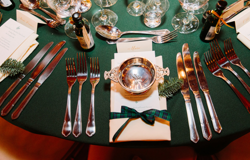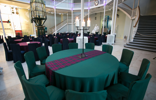 © 88 Events - Green Essential linen & chair covers, Bruce Tartan runner & wrought iron candelabra